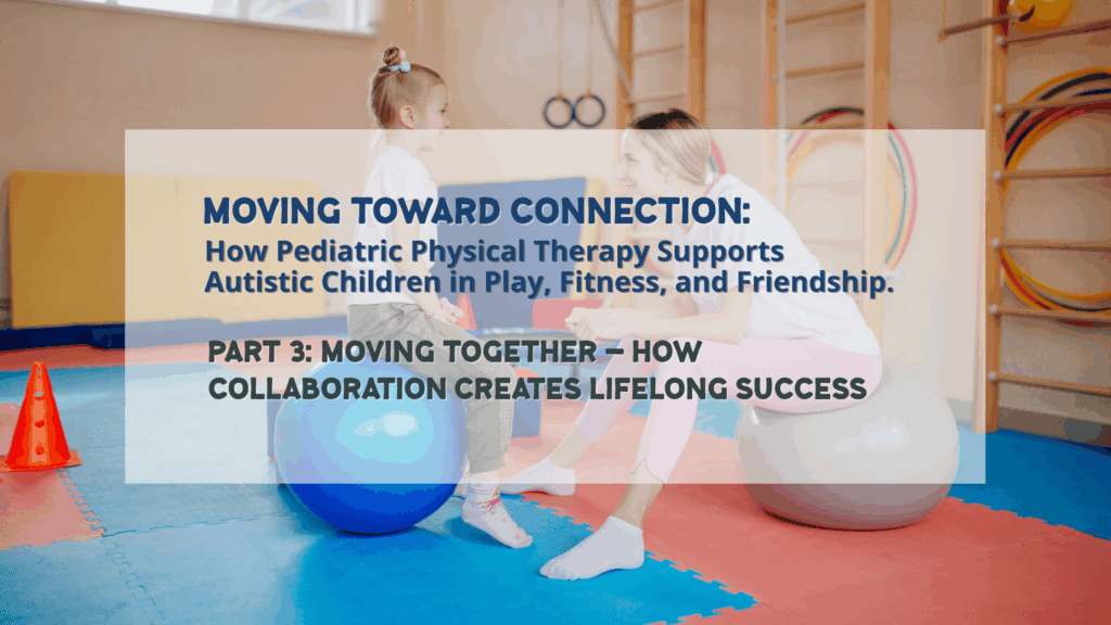 Written by: Shannon Steele DPT Introduction In Part 1 of our PT Month series, we saw how motor skills open doors to social connection. In Part 2, we explored how PTs adapt PE and sports to foster inclusion. For our final post in the series, we’ll zoom out to the bigger picture: collaboration. Because the […]